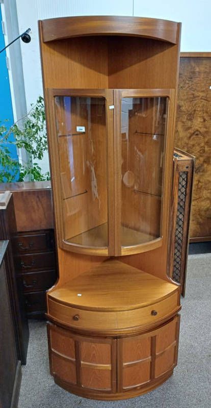 Parker knoll teak corner cabinet with 2 glazed panel doors over 2 drawers over 2 panel doors - 194cm tall