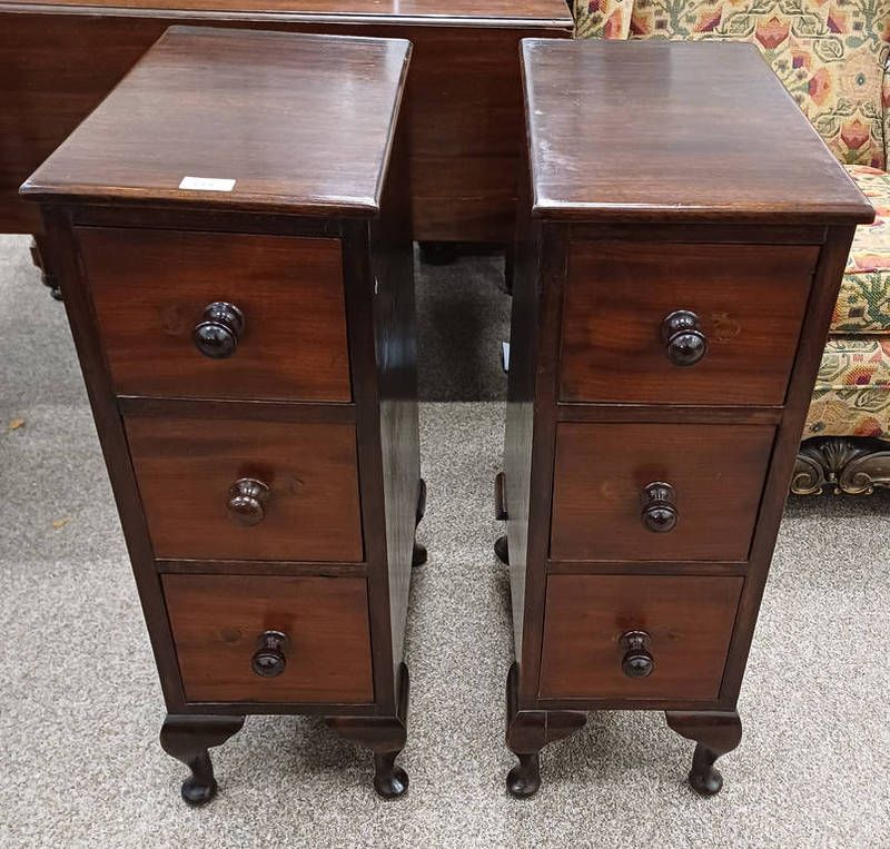 Pair of late 19th century mahogany 3 drawer bedside chests on short queen anne supports, 76cm tall