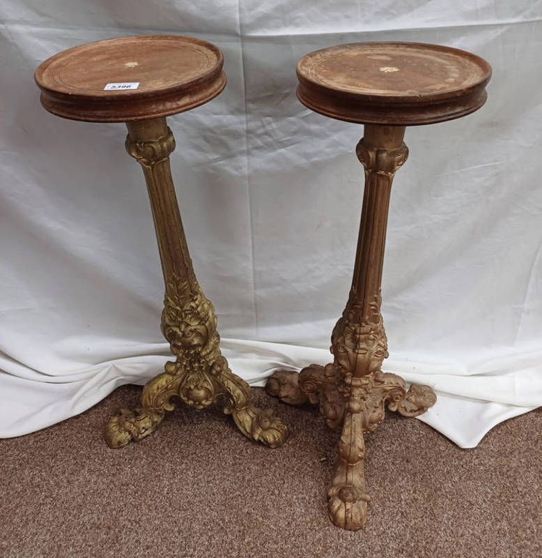 Pair of mahogany topped circular tables/potstands on decorative gilded metal pedestal with 3 spreading supports (as found)