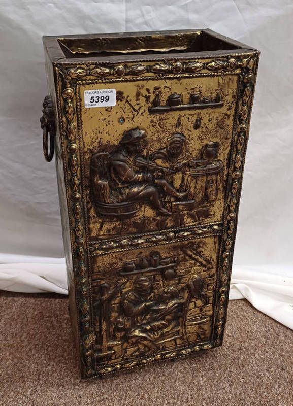 Embossed brass stick stand with classical scene decoration & lion mask handles