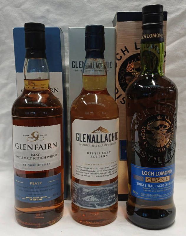 3 bottles single malt whisky: glenfairn - 70cl, 40% vol., glenallachie distillery edition - 70cl, 40% vol. & loch lomond classic - 70cl, 40% vol. all boxed