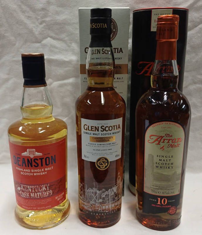 3 bottles single malt whisky; arran 10 year old - 700ml, 46% vol. in tube, deanston kentucky cask matured - 70cl, 40% vol. & glen scotia campbeltown harbour - 70cl, 40% vol. boxed