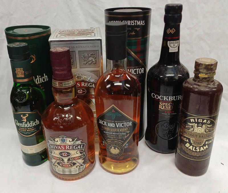 5 bottles: glenfiddich 12 year old single malt whisky - 35cl, 40% vol., jack & victor blended whisky, chivas regal 12, cockburns special reserve port & riga balsam