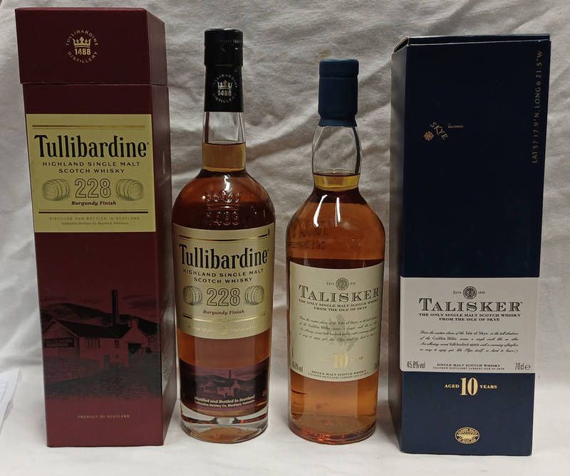 2 bottles single malt whisky: talisker 10 year old - 70cl, 45.8% vol. & tullibardine 228 - 70cl, 43% vol. both boxed