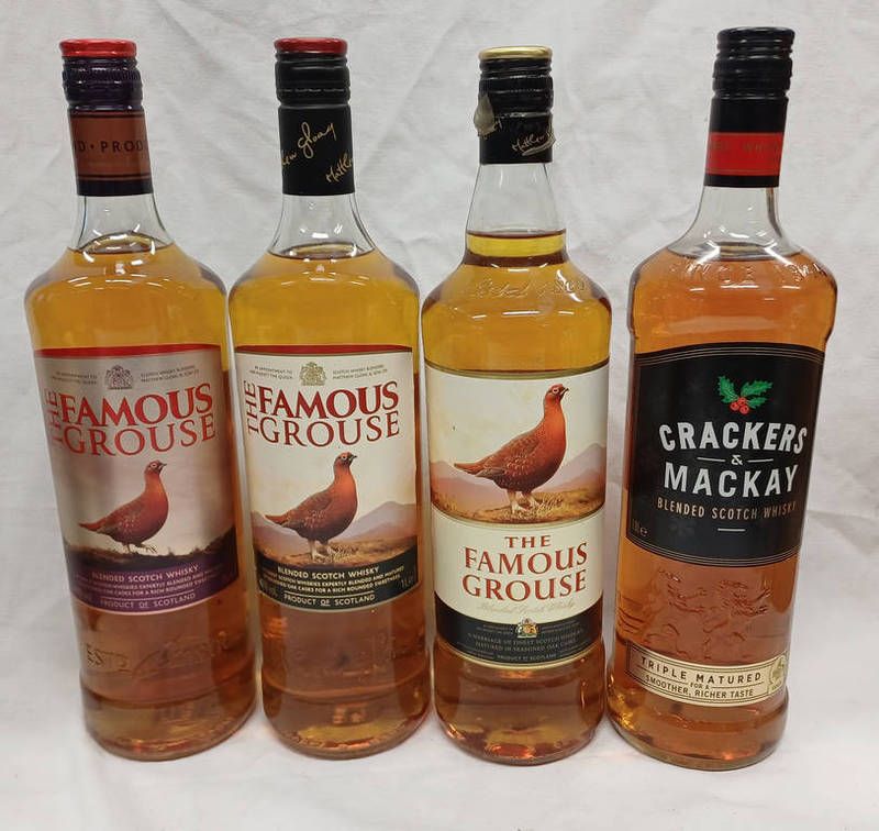 4 bottles of blended whisky; 3 bottles of famous grouse & 1 bottle crackers & mackay