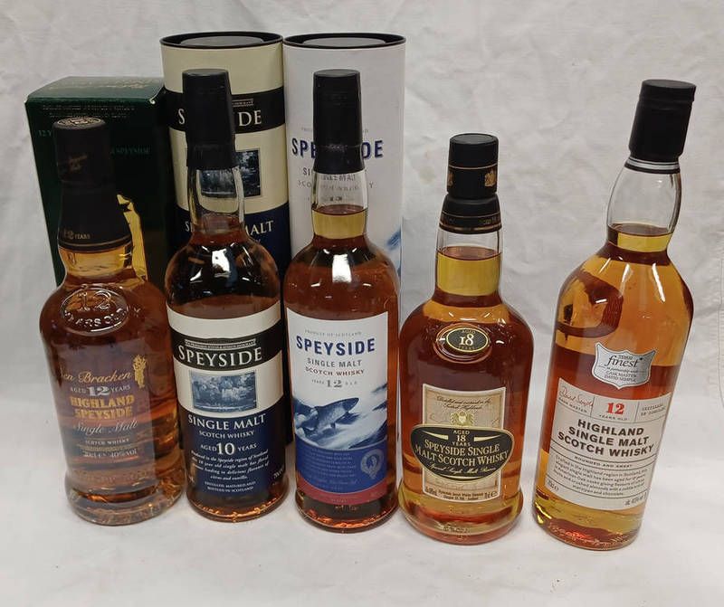 5 bottles of single malt whisky including an 18 year old speyside, 12 year old highland, etc
