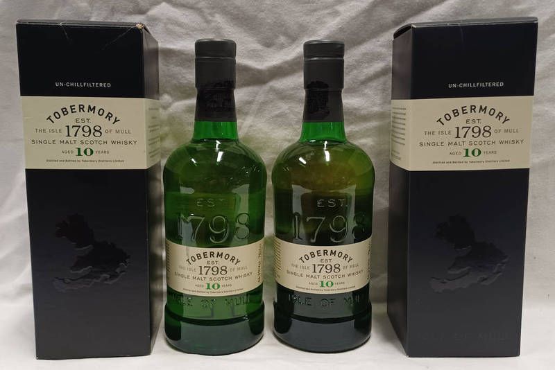 2 bottles tobermory 10 year old single malt whisky - 70cl, 46.3% vol. boxed