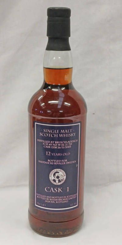 1 bottle bruichladdich 12 year old single malt whisky, private bottling for haddocks rivaler - 75cl, 62.3% vol.