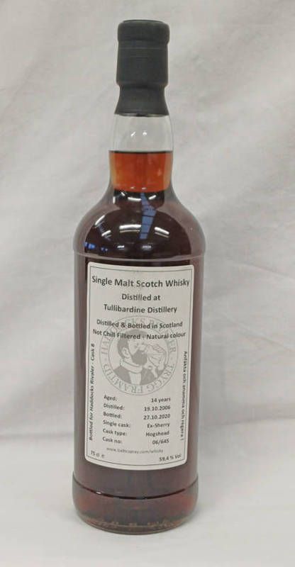 1 bottle tullibardine 14 year old single malt whisky, distilled 25.09.2006, private bottling for haddocks...
