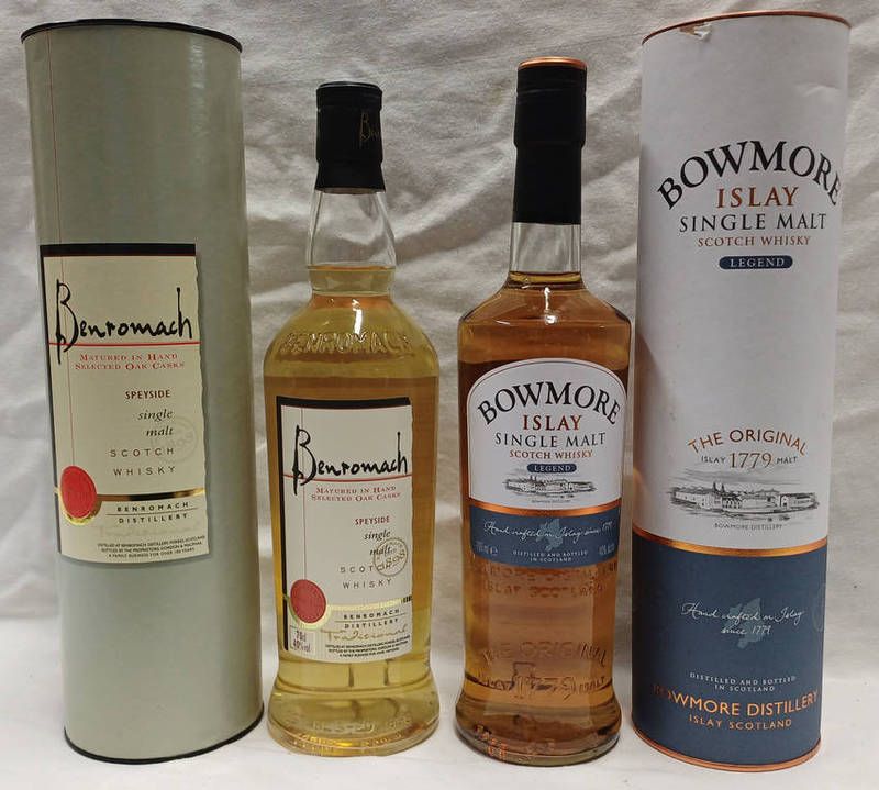 2 bottles single malt whisky: bowmore legend - 700ml, 40% vol. & benromach traditional - 70cl, 40% vol. both boxed