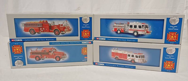 4 corgi limited edition premier fire rescue models including 54706 - el side mount washington d.c. us51503- american la france turbo chief san francisco, 52206 - e-one rescue baltimore & us50501 - seagrave anniversary pumper, columbus