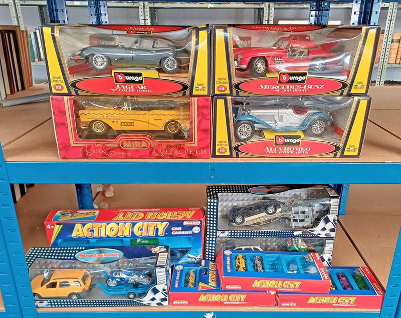 Four burago & mira 1:18 scale model cars including alfa romeo 2300 spider (1932) together with jaguar e type coupe (1961), mercedes-benz 300 sl and buick century (1955) and others