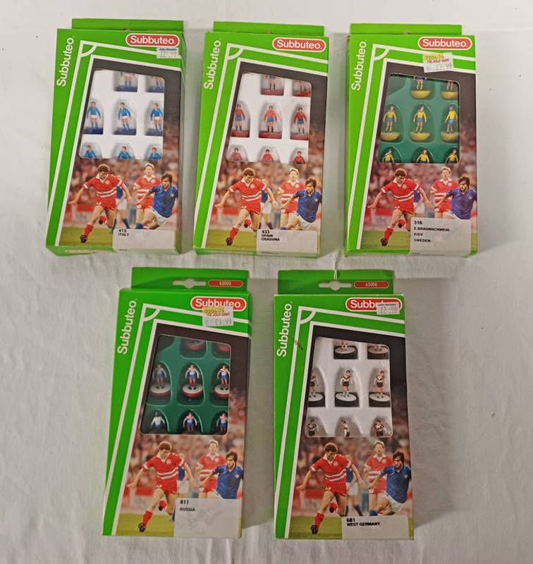 Five subbuteo table football teams including spain, germany, italy, russia and sweden