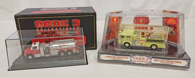 Two code 3 1:64 scale model vehicles including boston fire department la france pumper together with freightliner tanker. both boxed