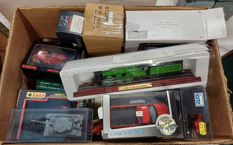 Selection of various model vehicles including challenger tank uk mainland division, vw volkswagen kubelwagen, 4-6-2 lner 4472 flying scotsman steam locomotive and others.