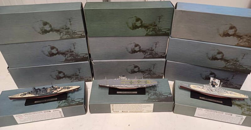 Twelve model ships from atlas editions including the bismark, u.s.s. missouri, h.m.s. exeter and others. all boxed