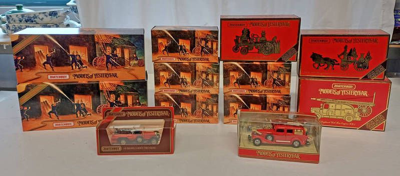 Selection of matchbox model fire engines including ys-43 bush self propelled fire engine, ysfe01-1930 ahrens fox ''quad'', ys9-1936 leyland 'cub' fire and others. all boxed.