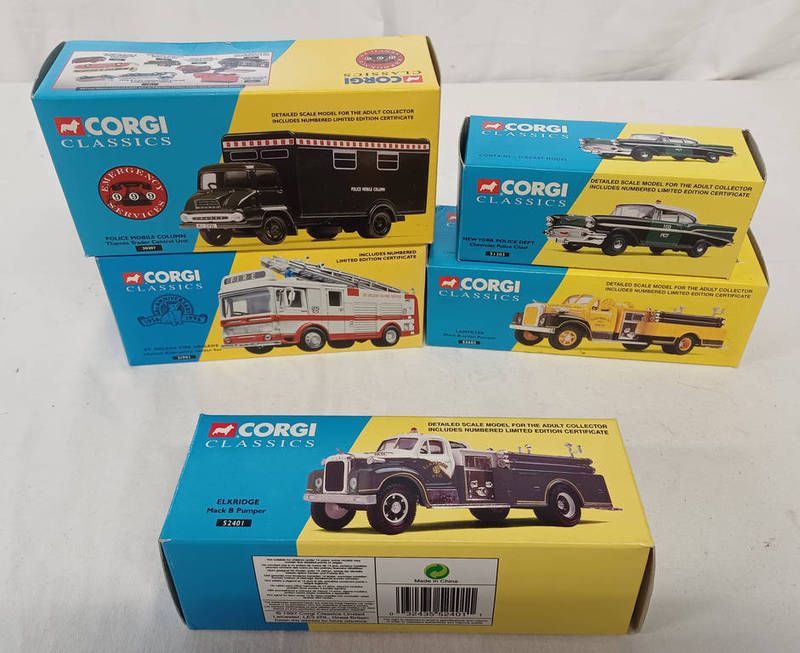 Five corgi classic model vehicles including 30307- police mobile column, thames trader control unit, 52603 lampeter mack b series pumper, 52401 - elkridge mack b pumper, 51303 - chevrolet police chief new york police dept and 21901 - leyland emergency tender, st helens fire brigade, all boxed