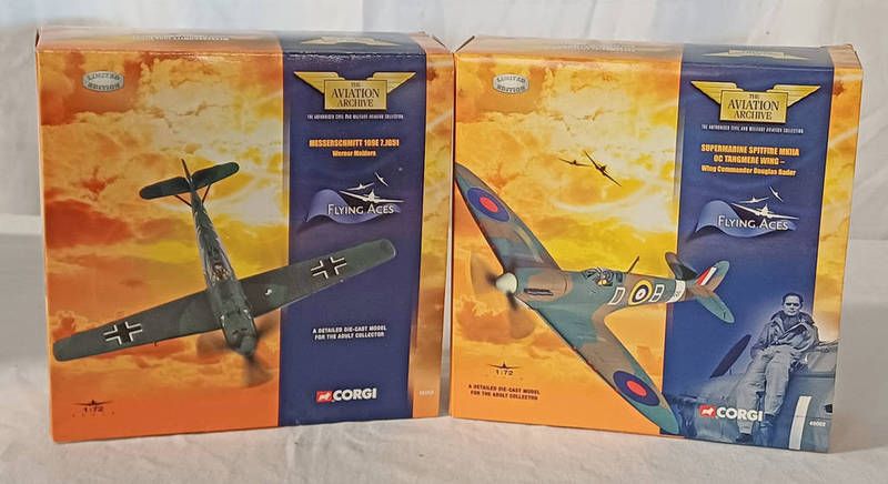 Two corgi model aircraft from the aviation archive range including 49002 - supermarine spitfire mkiia, wing commander douglas bader together with 49203 - messerschmitt 109e 7jg51 werner molders, both boxed