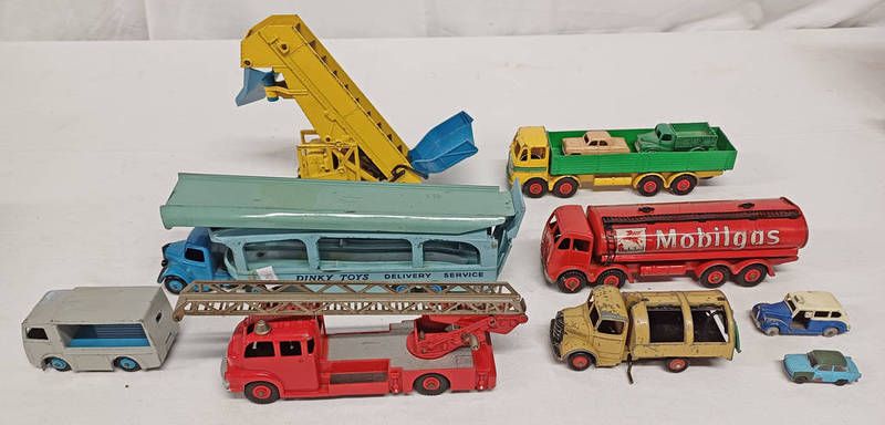 Selection of various playworn dinky toys model vehicles including - pullmore car transporter, foden 'mobilgas' tanker, fire engine & others