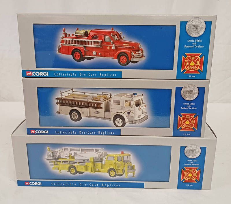 Three corgi model fire engines from the premier fire rescue range including us53802 - mack cf tower ladder san francisco together with us50502 - seagrave anniversary pumper tampa fl and us50802 - seagrave k, nasa fl