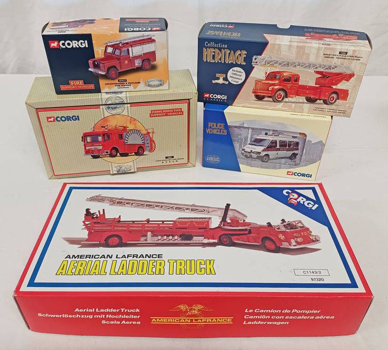 Selection of corgi fire service related model vehicles including 97320 - american la france ariel ladders truck, 21802 - hong kong aec fire truck, 07417 - land rover leicestershire & rutland fire service and others