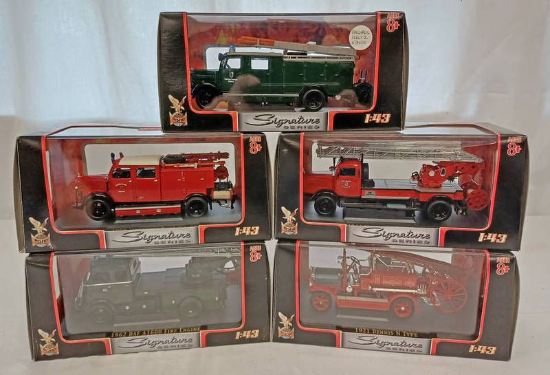 Five road signature series 1:43 scale model fire service related vehicles including 1950 mercedes benz tlf-50, 1921 dennis n type, 1962 daf a1600, 1941 magirus-deutz s 3000 slf and 1944 mercedes benz l4500f. all boxed