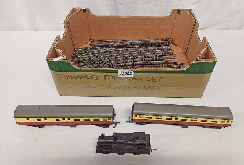 Oo gauge 0-6-0 locomotive together with carriages and track