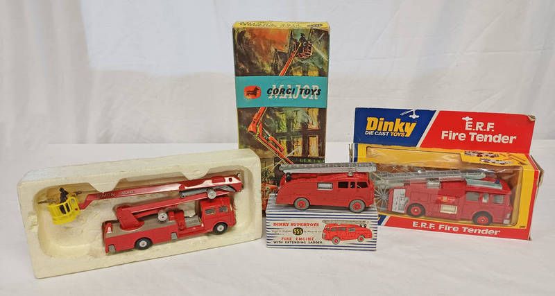 Three dinky and corgi toys fire service related model vehicles including simon snorkel fire engine together with erf fire tender and fire engine with extending ladder, all boxes