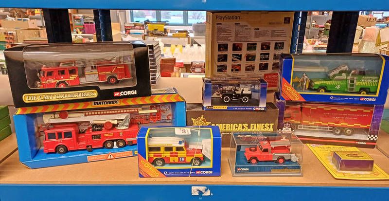 Selection of fire related model vehicles from corgi, matchbox, lledo etc including e-one top mount seattle, land rover leicestershire fire and rescue service, em-10 snorkel fire engine and others