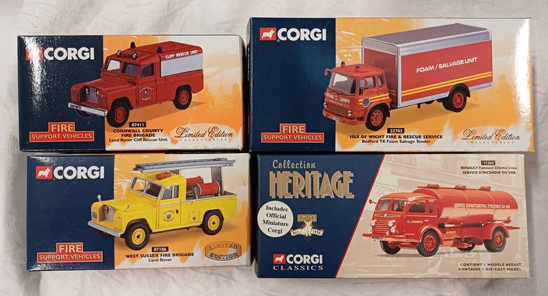 Four corgi fire service related model vehicles including 22703 - isle of wight bedford tic foam salvage tender, 71203 - renault faineant ceterne a eau, 07411 - land rover cliff rescue unit cornwall county fire brigade and 07106 - west sussex fire brigade, land rover