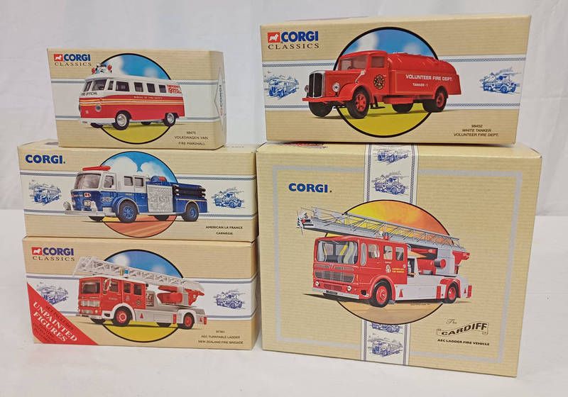 Five corgi fire related fire service related model vehicles including 97385 - aec fire ladder, cardiff, 97323 - american la carnegie, 98452 - white tanker volunteer fire dept, 97361 - aec turntable ladder new zealand fire brigade and 98475 - volkswagen van fire marshall