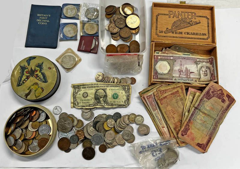 Uk & world coinage & bank notes to include various us coins to include a 1941 quarter dollar, morocco franc, 1921 one shilling, spanish pesetas, us 1993 one dollar note, decimal coins, commemorative crowns, saudi arabia one riyal notes, etc