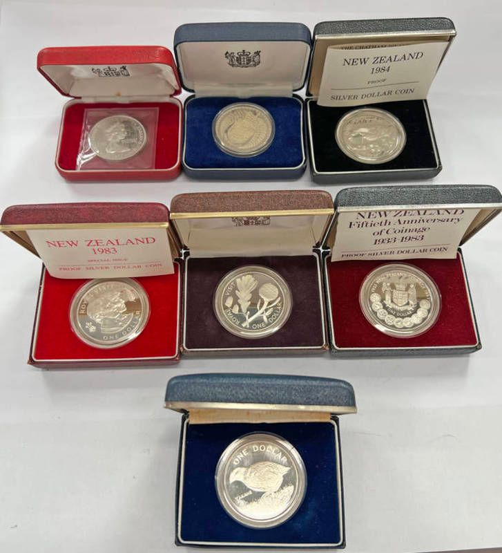 7 x new zealand silver proof commemorative crowns to include: 1977 waitangi day; 1979 fern; 1981 royal visit; 1982 takake; 1983 royal visit; 1983 50th anniversary; & 1984 black robin, each cased, some with c.o.a.