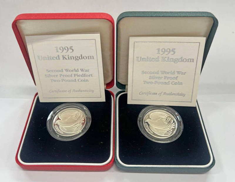 1995 uk silver proof piedfort peace dove �2 coin & 1995 uk silver proof peace dove �2 coin, both cased, with c.o.a.