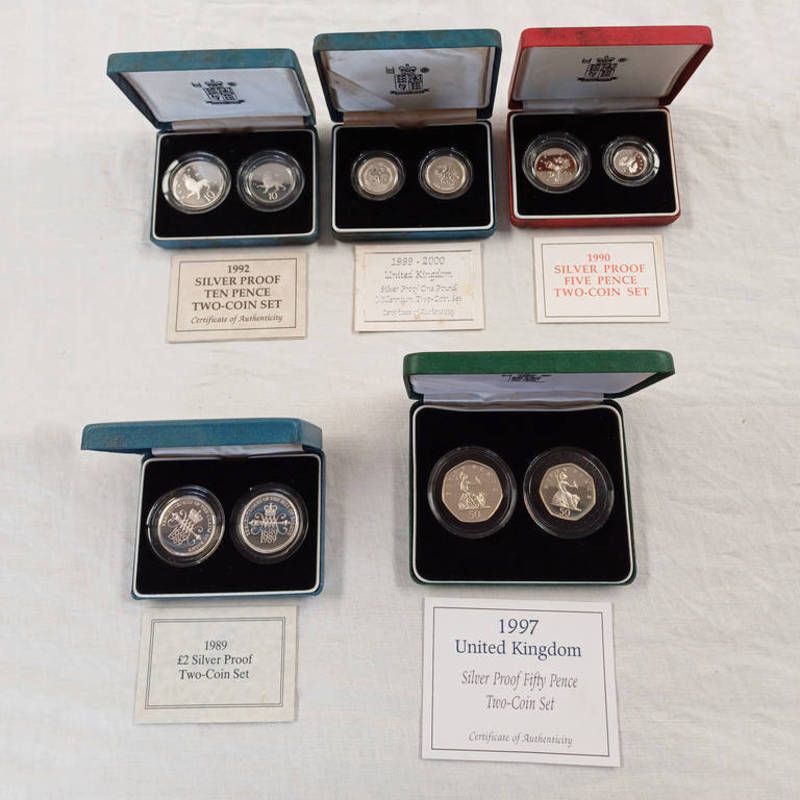 Selection of various silver proof coin sets to include 1989 �2 two-coin set, 1990 five pence two-coin set, 1992 ten pence two-coin set, 1997 fifty pence two-coin set, and 1999-2000 one pound millennium two-coin set.