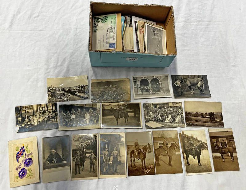 Selection of postcards to include various ww1 military scenes, cavalry officers, hanover park club 1916, shrapnel barracks woolwich, ww1 silk postcard, cameron highlanders pipe band, dundee, arbroath, skye, lossiemouth, etc