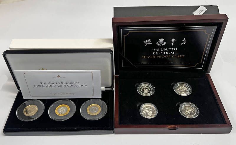The united kingdom's new & old �1 coin collection, in case of issue, with c.o.a., together with a cased set of four uk silver proof one pound coins including 1984, 1986, 1987 & 1990 issues