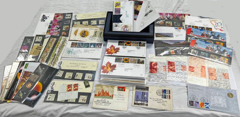 First day covers and presentation packs to include gpo first day cover forth road bridge 1964, parliament for scotland philatelic numismatic cover no 01274, royal mail millennium stamps entertainers tale, christmas 1994, robert burns etc in one box