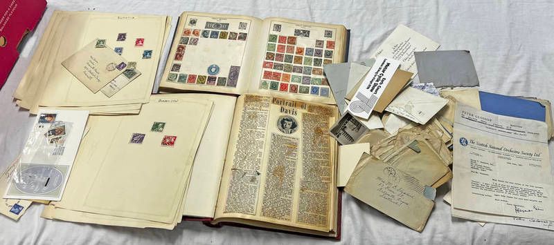 Selection of stamps and postal history to include the strand stamp album with contents to include penny reds, germany, new zealand, united states of america, maritime and air mail from ww2 to a arbroath address, scrap book album relating to bette davis etc in one box