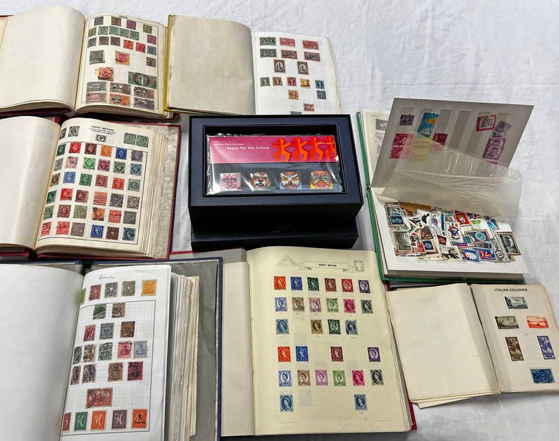 Seven folders of gb and world wide stamps and royal mail millennium collection first day covers in one box