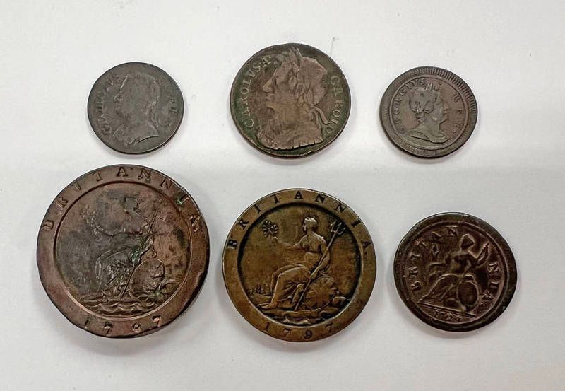 6 x 17th & 18th century copper coinage to include: 1675 charles ii halfpenny; 1719 farthing; 1749 george ii farthing; & 1797 george iii two pence & penny