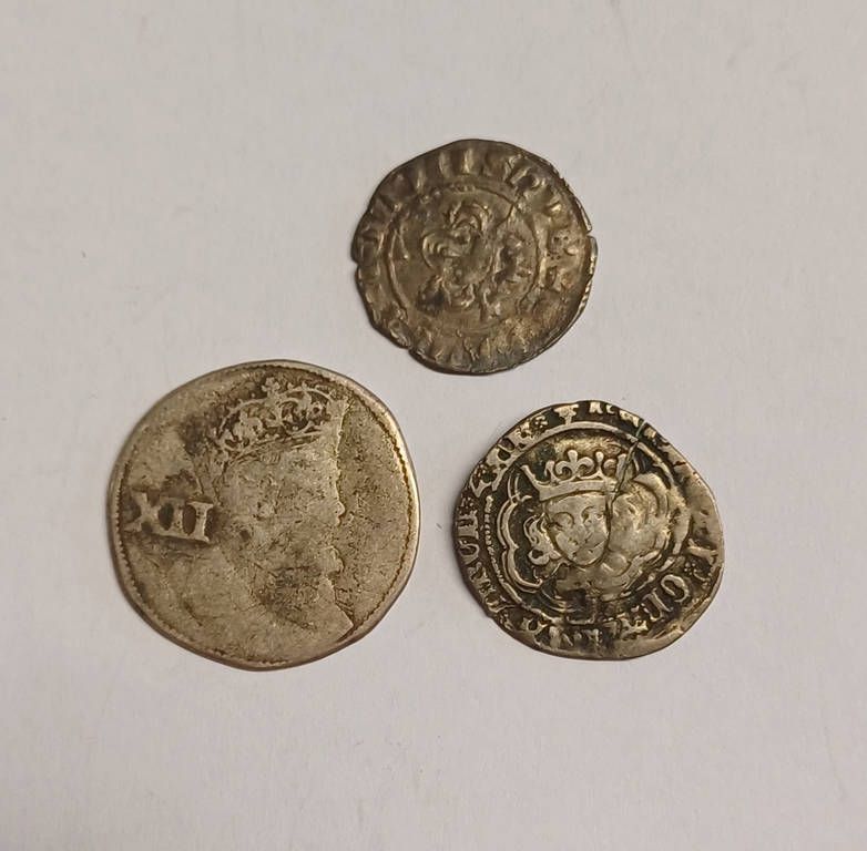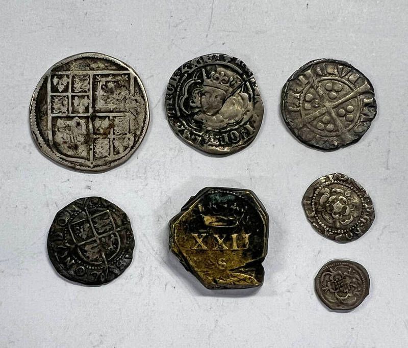 Good selection of hammered coins to include edward i long cross penny, york mint, henry vii half groat, elizabeth i half groat, james i shilling, james i penny, charles i halfpenny and a james i unite coin weight