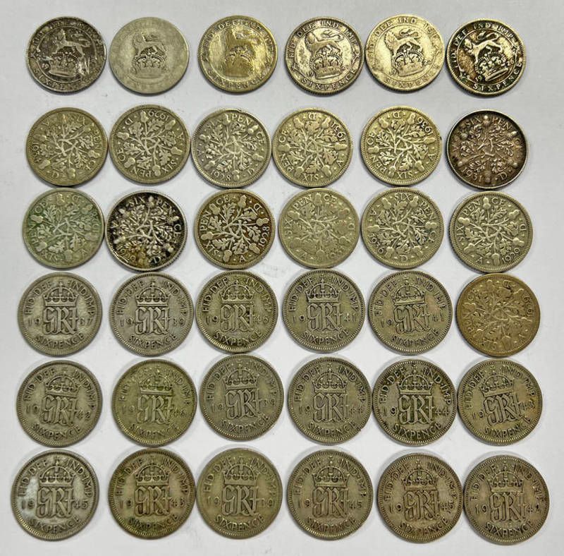 1920 - 1947 silver content six pence's, 97 grams
