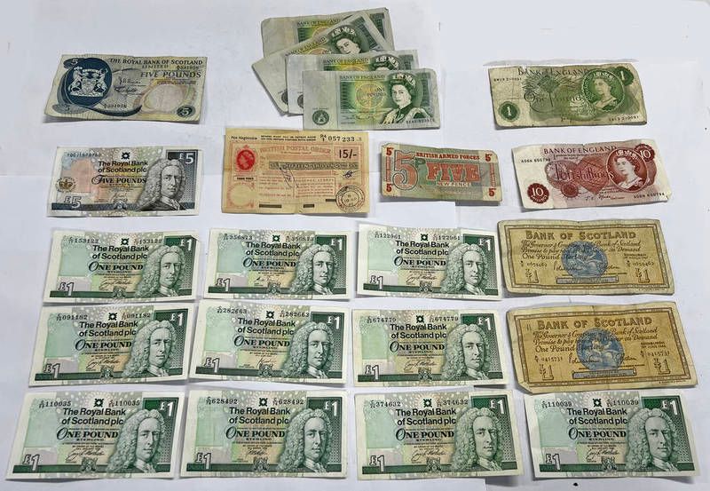 Bank notes to include 10 royal bank of scotland plc �1 notes, 1969 rbs �5 note, 2002 �5 note, british armed forces five new pence note, 1965 british postal order, bank of england 10 shilling note, 1966 and 1967 bank of scotland �1 note etc