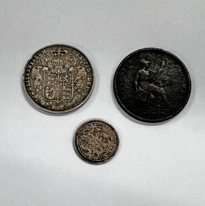 George iv 1828 silver half crown coin, 1818 george iii silver six pence and a 1826 george iv penny - 3 -