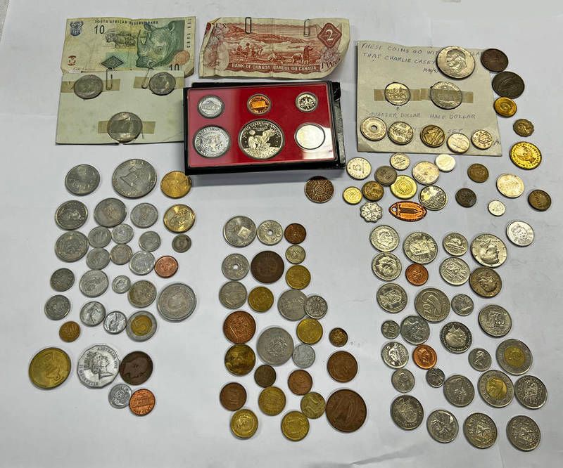 American and canadian coins to include us 1977 proof set, 2 dollar bill, dollar and half dollars, 2 dollar canadian bank note, and other coins etc
