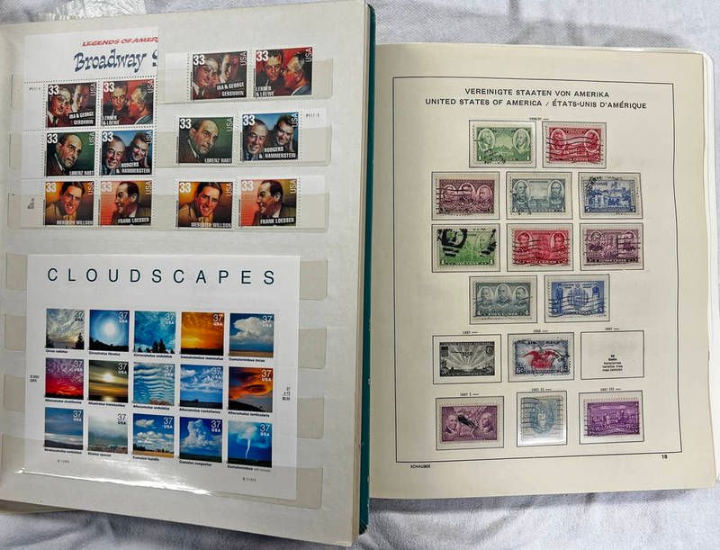 Two albums of american stamps to include air mail, american film making behind the scenes, cloud scapes, pacific coral reefs, road runner, donald duck, endangered species etc -2-