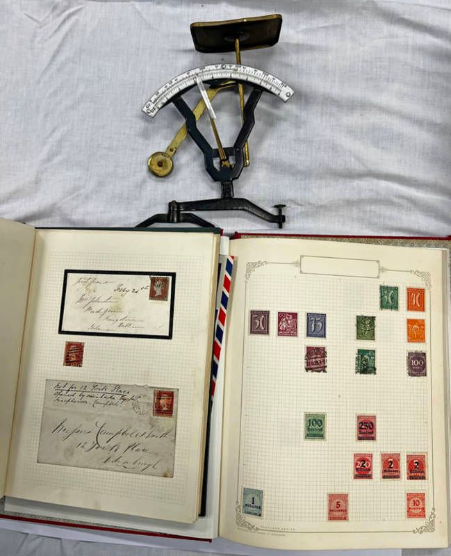 Two stamp albums with contents of various stamps and postal history to include penny reds, 19th century envelopes with penny red stamps to edinburgh, commonwealth stamps, gb, german inflation stamps, etc and a set of scales -3-