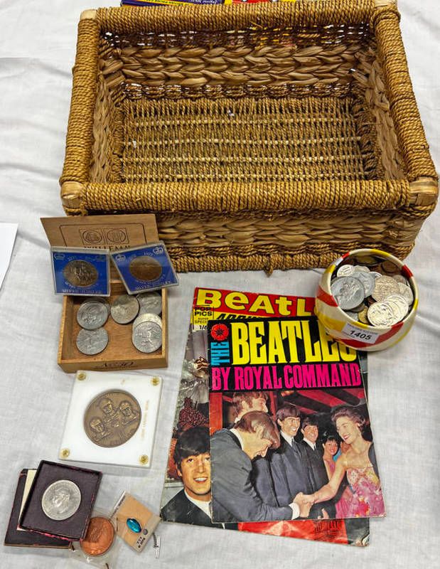 Gb and world wide coinage, apollo 11 bronze medallion, beatles around the world magazine, the beatles by the royal command magazine, etc in a wicker basket
